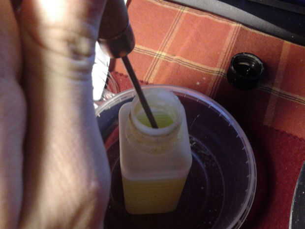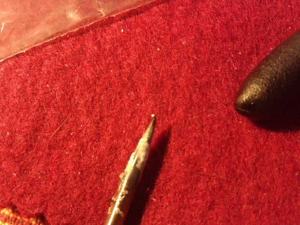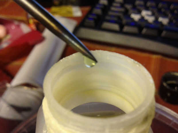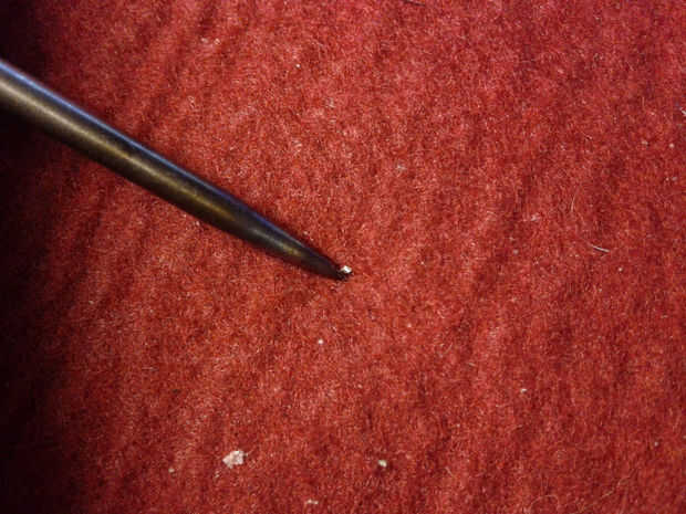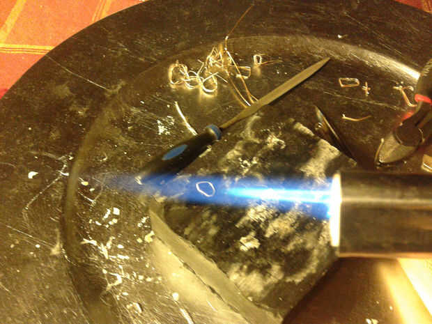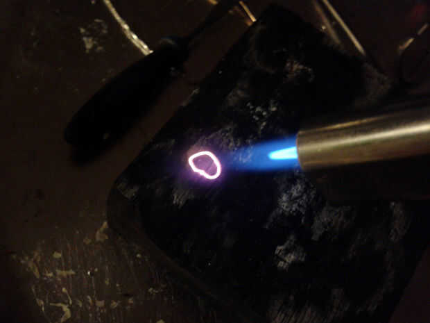 - Derretir la soldadura a una bolita y luego utilice su aguja de titanio para aplicar la soldadura directamente a donde usted necesite. En forma semi fundida el estaño se adhieren al su aguja hasta que da una mejor alternativa (preheatet plata en este caso) o se enfría. No tanto porque lo encuentro que necesito mis manos para otras cosas.
