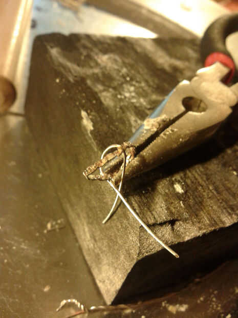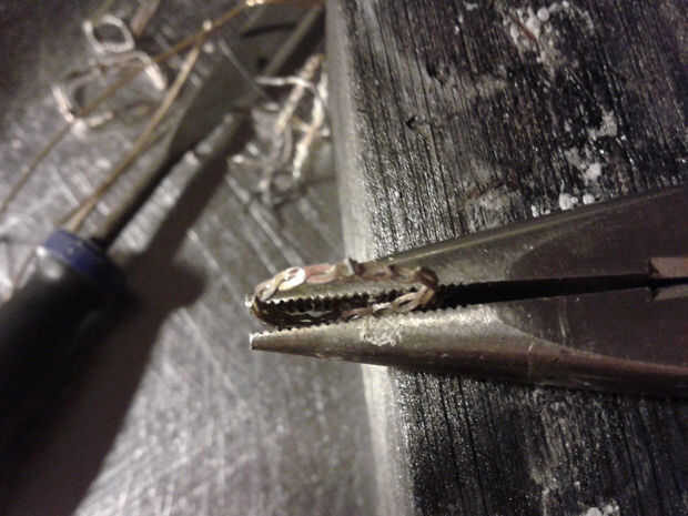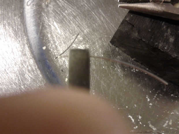 - A continuación, aplica un flujo en la cara de la llanta y poner alguna soldadura en. después de esto fui a agarrar uno de mis hilos para que la parte que debe ir sobre el borde estaba en mis alicates (esto se convertirá en uno de los dientes para el ajuste después de). Aplique un flujo en el cable también.