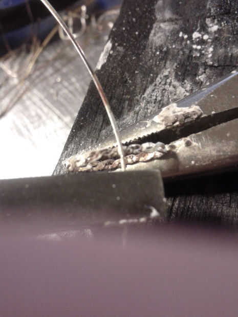 - Calienta la llanta hasta que vi el flujo de la soldadura. Presionando el alambre firmemente contra el lugar donde poner la soldadura, recalentar todo hasta que vio/fieltro alambre pegado a la llanta (esto va a necesitar un poco de práctica pero no es súper difícil conseguir derecha :)). Felicidades si has seguido estas instrucciones usted fija su primer diente!