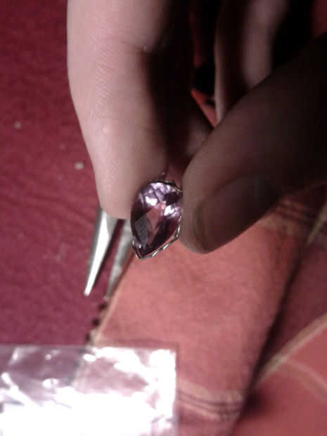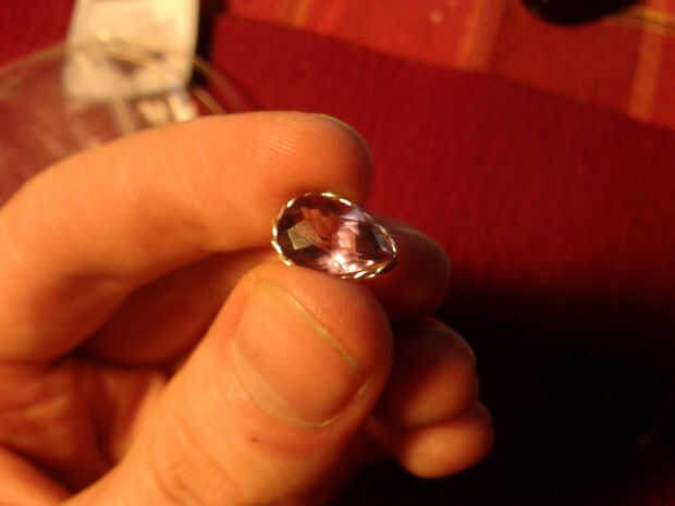 - Ahora ya que el ópalo era plano tuve que hacer una pequeña cesta para ella. Medido (conjeturado) hasta en el escenario debe pasar y luego doblar el alambre alrededor de al otro lado de la llanta con el espacio apropiado en la parte trasera. Esto será diferente para cada piedra (Amatista im usar en este ejemplo no funcionará en absoluto porque tiene un trasero cónico)