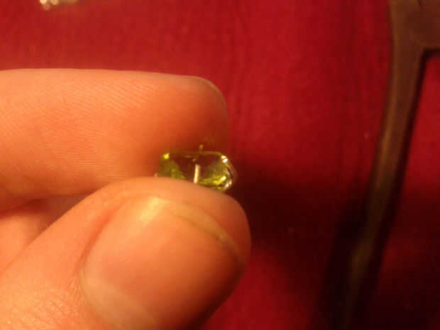 Coloque la piedra entre los dientes para mantener nivel. Clip los dientes en aproximadamente 1 o 2 mm (3/64 - 5/64 pulgada) (clip algo menos de mucho desde que mabye puede ajustar más adelante). Si la piedra tiene facetas en los lados puede utilizar para ayudarle a adivinar. Usted quiere los dientes lo suficientemente largos para descansar en todo espesor de la faceta pero no en la mesa (flat top).