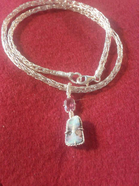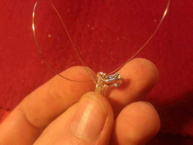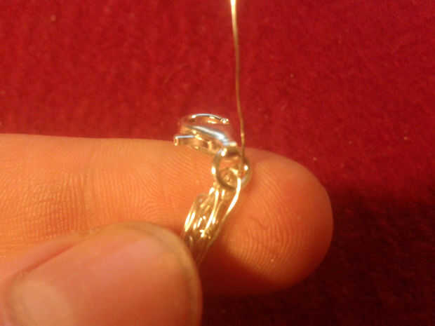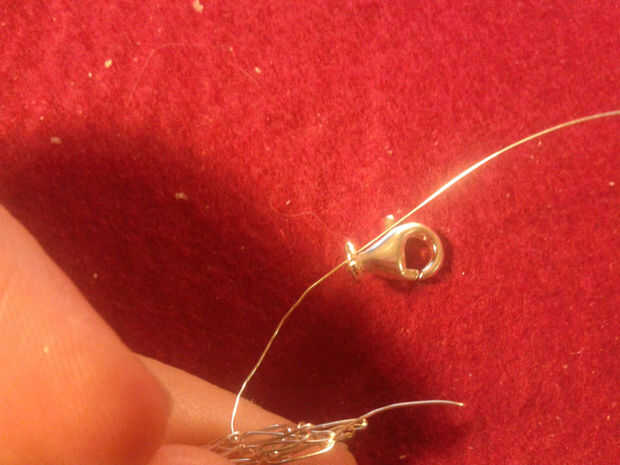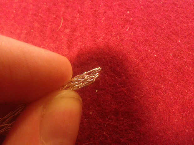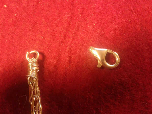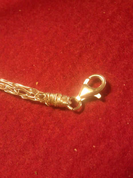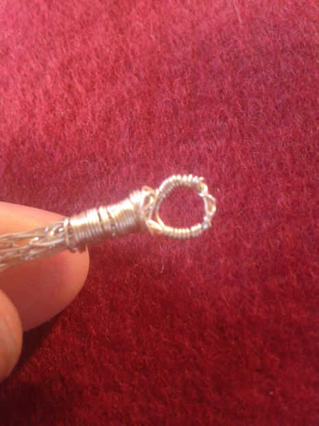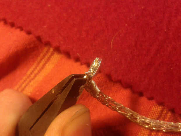 Ahora el final no verá a bien. Así que decidí envolver con el alambre fino. Usar un pedazo largo de alambre de plata fino primero había fijado la jumpring de un corchete al final, tejer el hilo un poco tiempo a través de la cadena y el lazo. Entonces hice un bucle justo aunque la jumpring así que tuve un inicio limpio. De allí que con cuidado pero firmemente wraped el cable alrededor de la cadena en filas hasta que tuve la sensación de que la Jumpring sería seguro. Tejer el hilo varias veces a través de la cadena para evitar que los extremos de desentrañar. Entonces yo cortar.
