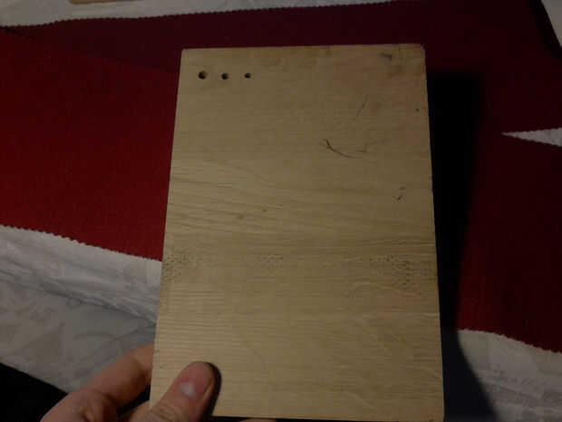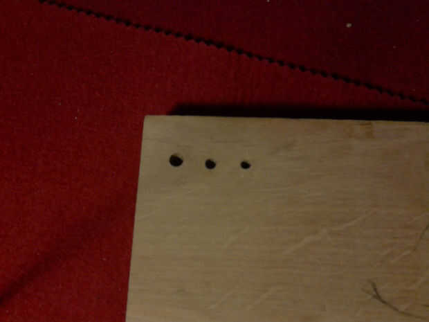 - Se trata de un tablero de madera grueso que taladré agujeros consecutivamente más pequeños. empieza en ~ 5 ~ 6 cm de diámetro y final en alrededor de 3 cm. Esto se utilizará para "dibujar" la cadena que incluso hacia fuera y su espesor final