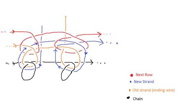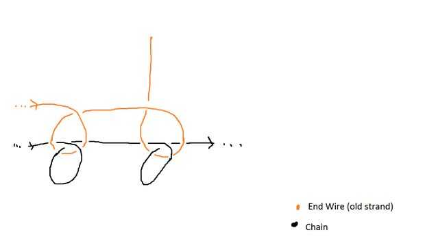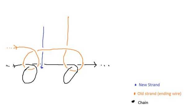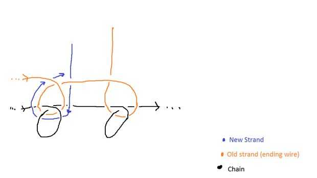 Ahora sigue la hebra antigua junto con el filamento nuevo y bucle aunque la misma parte de X como el bucle final.