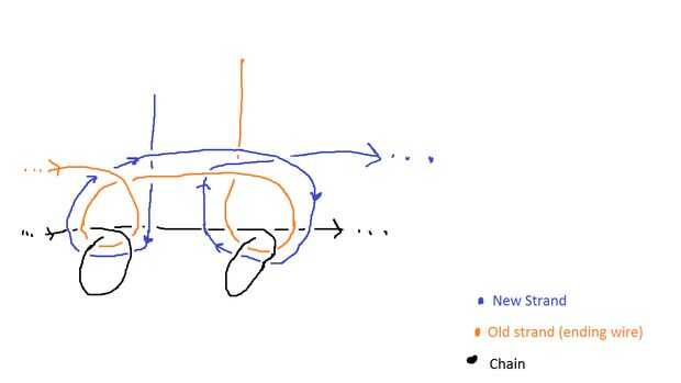 Después de terminado el filamento viejo volver un lazo (de ahora en adelante llamado el final-loop). Ahora tomar un extremo del nuevo stand y pasar bajo el puente entre el circuito final y el final-loop y seguir la pre-final circuito metiendo el cable bajo el puente entre el final-lazo y del lazo antes de.