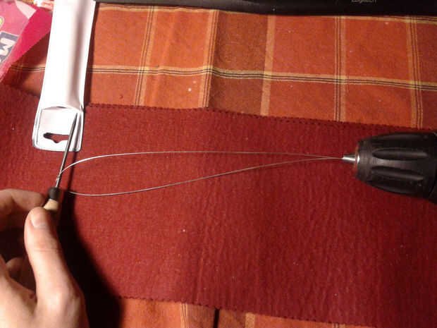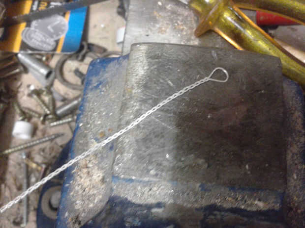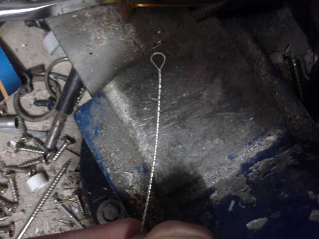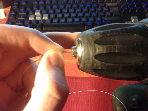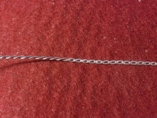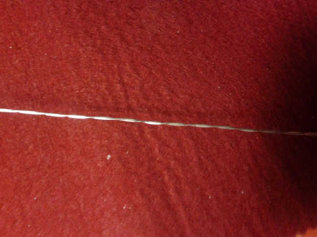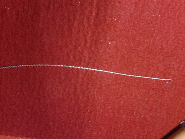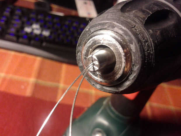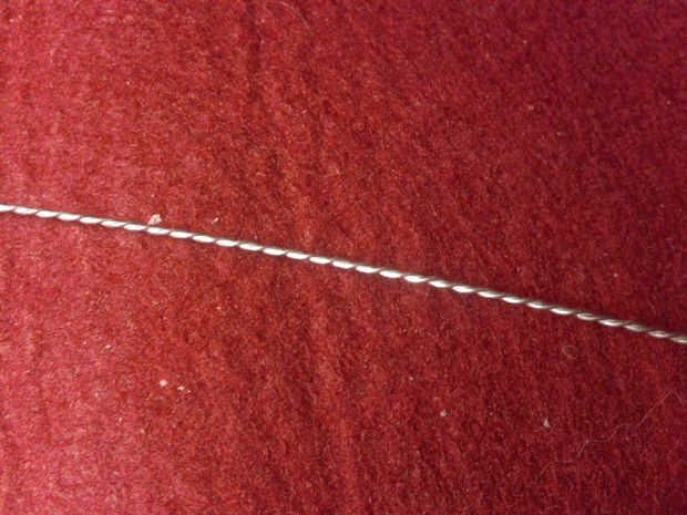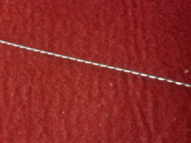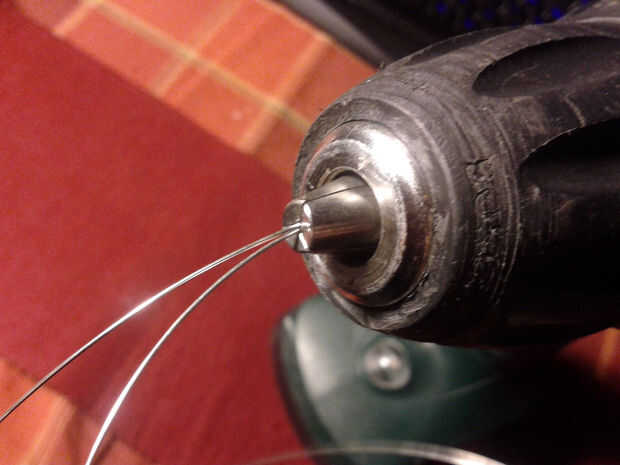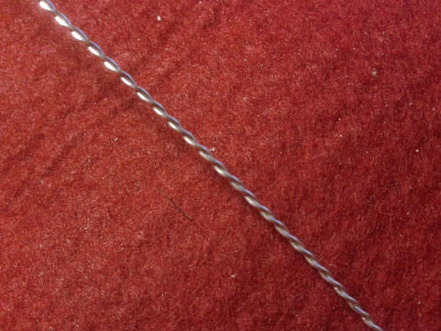 Para hacer el cable que estaba usando, usted tiene que tomar un pedazo largo del cable 0, 5mm plata y doblar por la mitad. Entonces sujete ambos extremos juntos en el atornillador taladro menos. Ahora toma tu aguja de titanio, para fijar la parte de lazo con él y gire lentamente el cable hasta que es trenzado uniformemente.