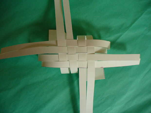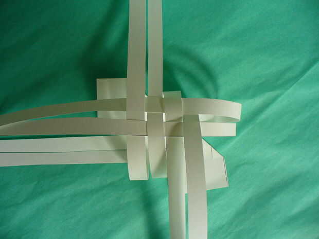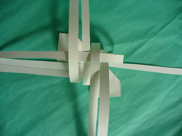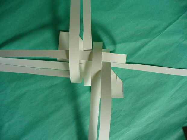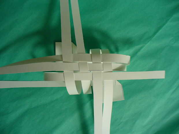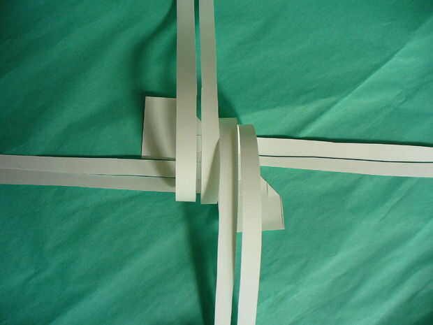 Siguiente tire hacia abajo la parte superior 2 tiras en la posición sur - cinta para mesa (más fácil de trabajar con pegadas a la mesa – no usar mucha cinta - esto es para mantener mientras tejemos). Luego tire de las tiras del Sur 2 a las posiciones del norte. Ahora han formado 4 lazos para iniciar el proceso de tejido. Con este 2 tiras les tejen los lazos 4 * más 1 bajo 1 *, luego seguir con las tiras de Occidente 2. Una vez terminado te debe haber formado el cuerpo. Su pájaro es en su parte posterior - se revolcará en el paso siguiente.