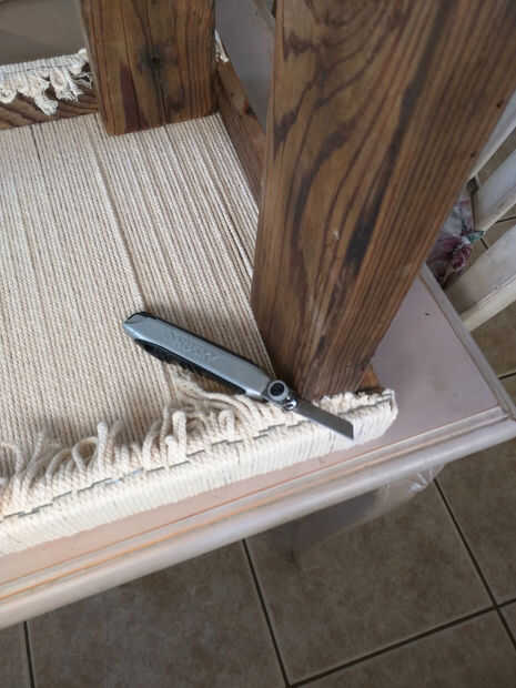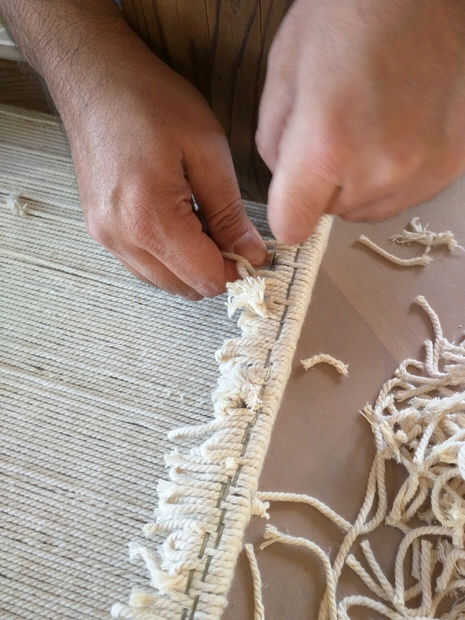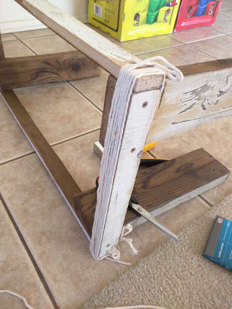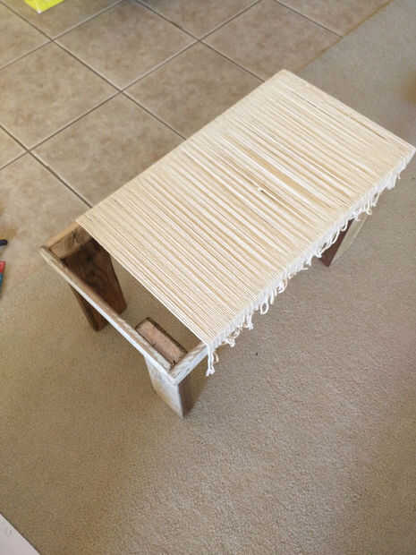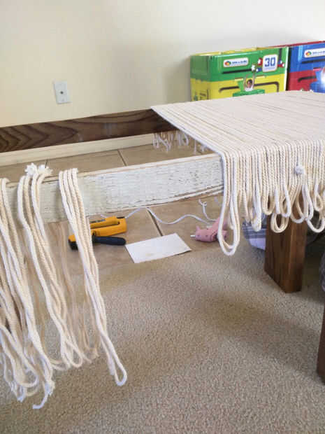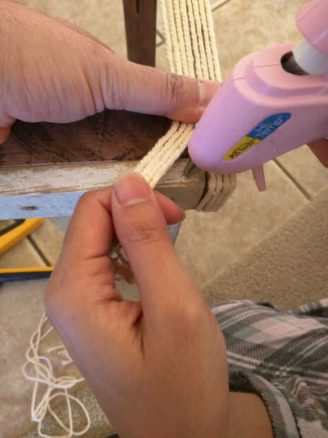 El paso siguiente fue unir la parte superior. El hilo de algodón que tenía era de los restos de una hamaca y muy fino. Así que, decidí utilizar 4 hilos para cada longitud. Primero, pega las hebras con la pistola de pegamento caliente y luego sujetado con grapa en la madera en la parte inferior de la tabla. Finalmente recortan las roscas exceso usando un cuchillo.