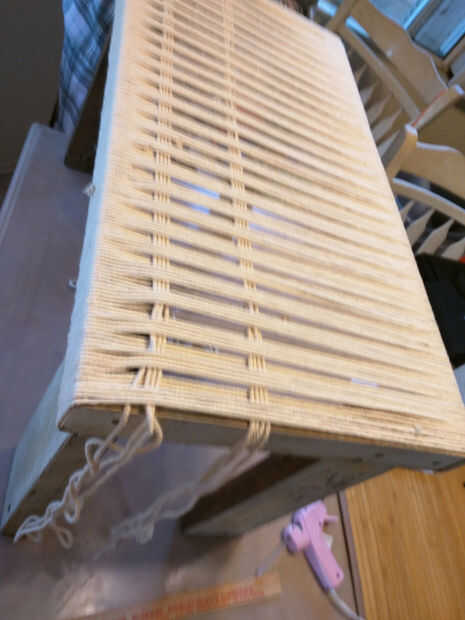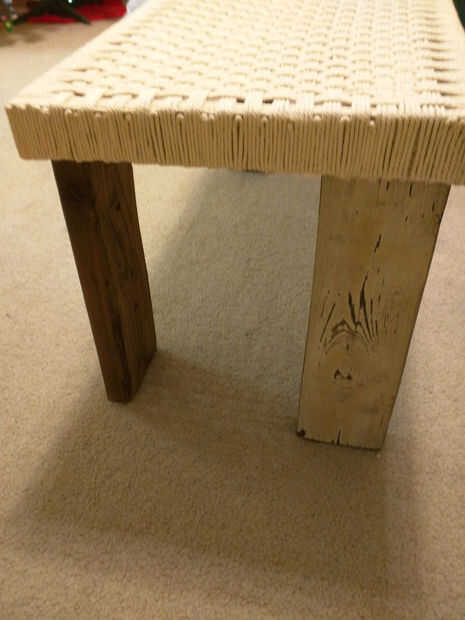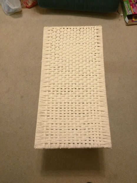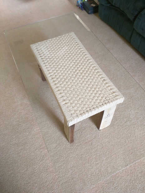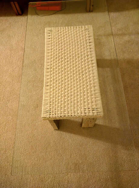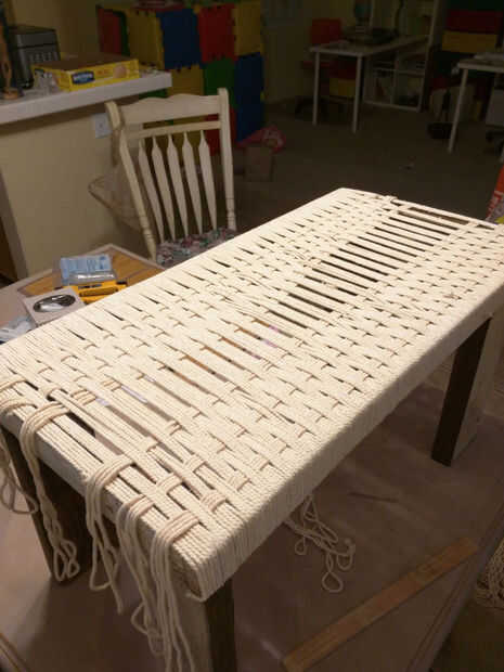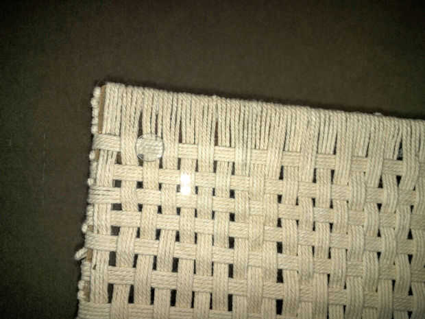 Con 4 cuerdas empecé a tejer en el uno por el patrón a lo largo. Los 2 primeros tejidos tardaron un poco más pero una vez que se realizaron fue más fácil tejer los otros. No fije los hilos a la madera hasta que completé la armadura entera. Un otro problema que enfrentó fue que los 4 hilos de cada armadura guardó conseguir enredado. Paso mucho tiempo alisando hacia fuera luego. Una vez completa la armadura entera me pegado y había grapado un lado primero. Entonces tiró tan duro como pude para eliminar cualquier holgura y tensión antes de pegar y grapar. Había acabado de la misma manera por recortar los hilos.