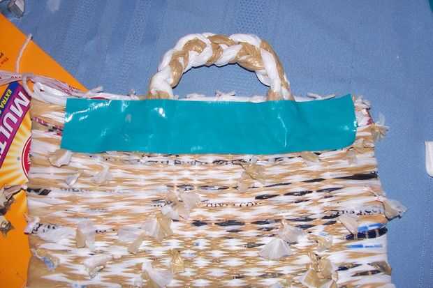 Ahora es el momento para hacer y adjuntar algunos mangos a tu nuevo bolso bolso tejido plástico. Usted puede hacer estos sin embargo desea y fuera de lo que quieras, pero si usas bolsas de plástico Asegúrese de que son lo suficientemente fuertes como para soportar su bolso y lo que pones en él. Mina se hicieron de bolsa de plástico manijas torcidos y trenzados juntos. OK, ahora que tiene las asas es tiempo para pegarlas! Si usted está bien versado en las formas de fusión de bolsas de plástico puede fusionarlos en. Sin embargo he utilizado cinta adhesiva para conductos. ASEGÚRESE DE QUE SU BOLSA ES REVÉS!!!!!!