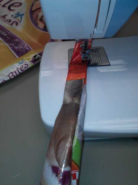 Usando una máquina de coser, coser la tira doblada. Coser las tiras de 5 o 6 juntos y dejar sobre un pie que se desarrollaba así que usted puede agregar más como usted necesita. Enrollé mi tira en un pedazo de cartón hasta que estaba lista para la silla de la armadura.