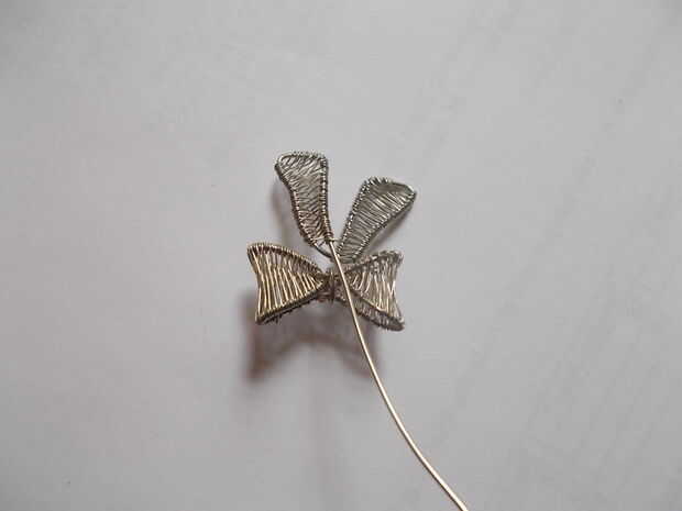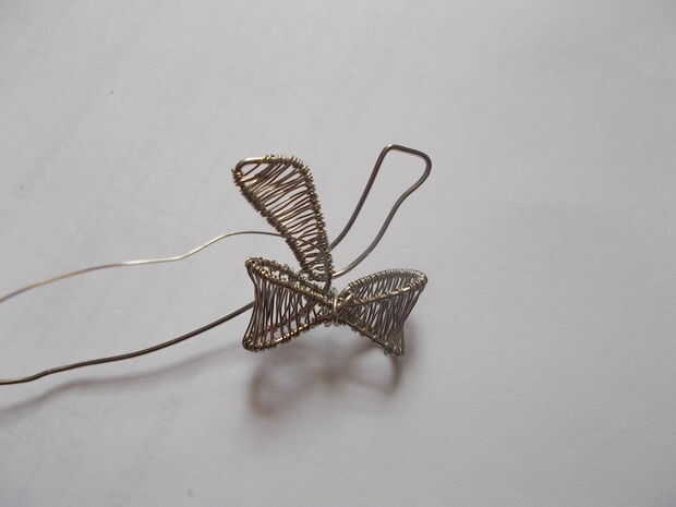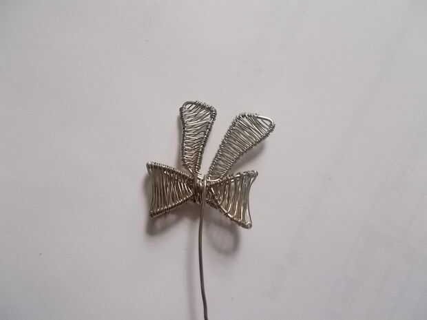 Cuando termine de tejer, cortar el exceso de cable fino y aplanar el extremo cortado con alicate. Envuelva el alambre grueso alrededor de la mitad del arco una vez, asegurándose de que los dos extremos del arco están tan cerca de la parte superior de la mariposa del arco como sea posible.