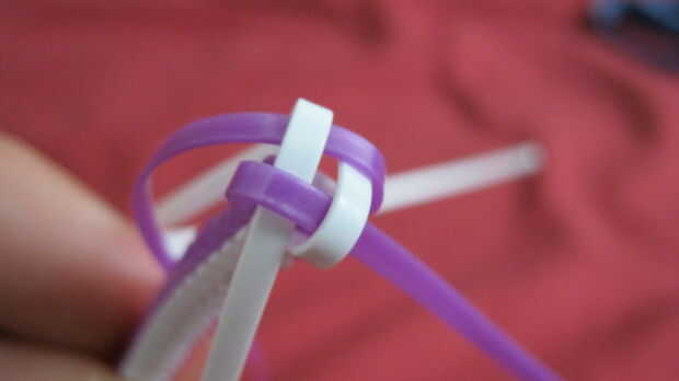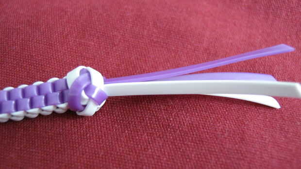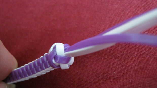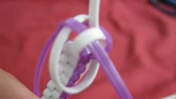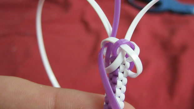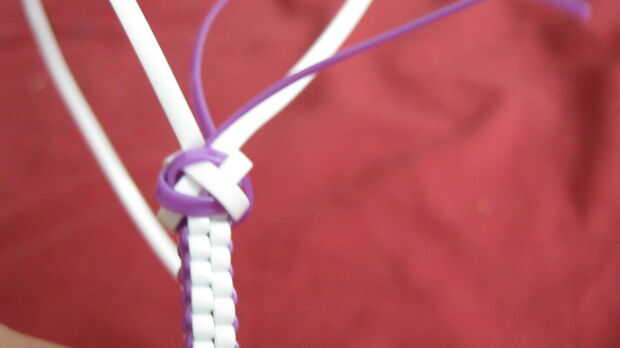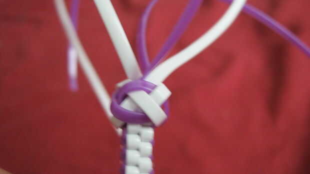 Tomar una de las cuerdas y correr hacia la izquierda pasando una cadena. Luego poner debajo de la cadena del mismo color en el otro lado y traer para arriba a través del medio. Tome la cadena que usted fue sólo alrededor y hacer lo mismo. Entonces una vez más.