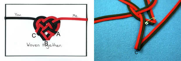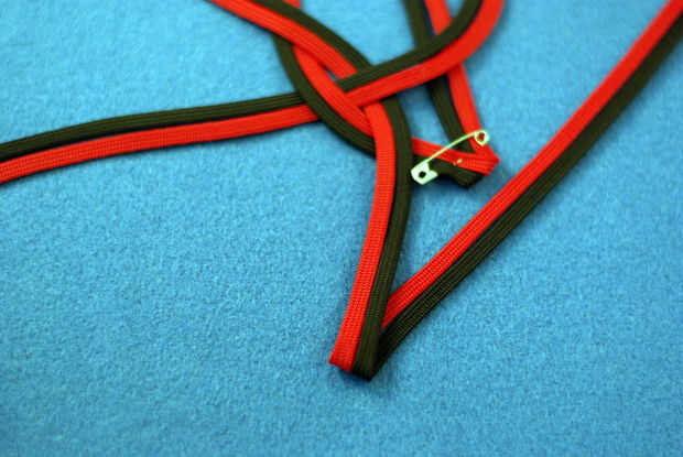 El paracord bajo una tercera vez, otra vez invertir en el exterior y que está en el interior del doblez. Esto es C el doblez en la tarjeta terminada, en el lado izquierdo.