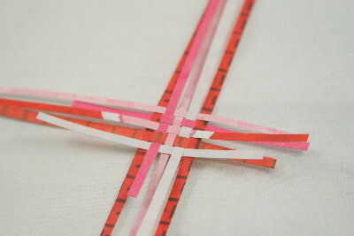 El tejido es muy simple. Simplemente cortar un manojo de tiras estrechas de colores mezclados de papel, aproximadamente 1/8" de ancho, luego comenzar a tejerlos juntos.