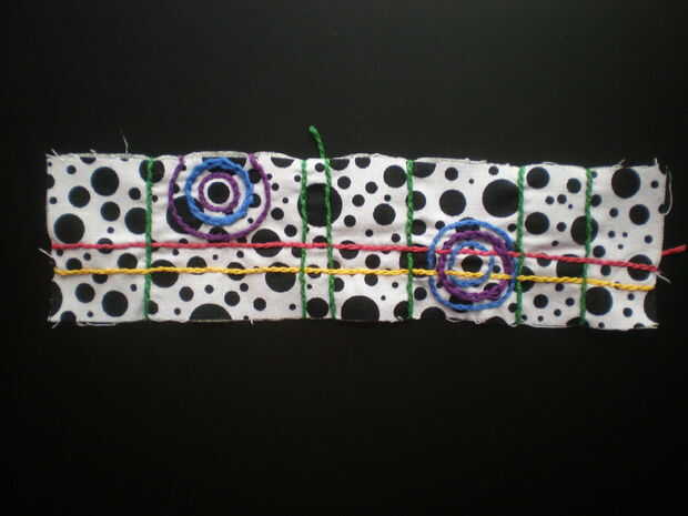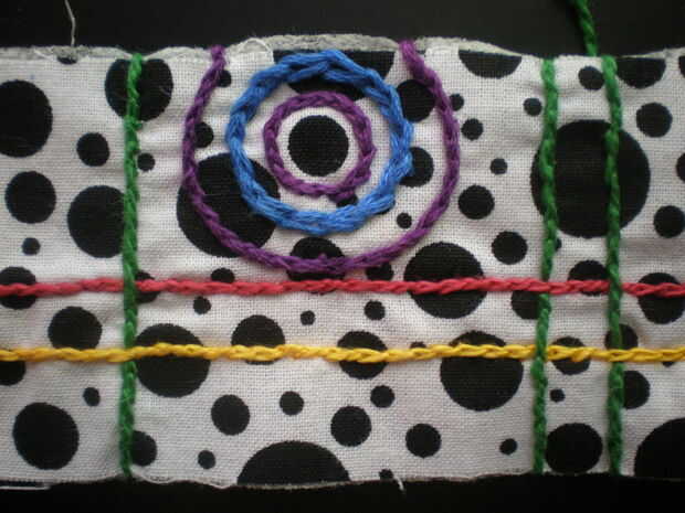 He utilizado un split (pespuntes) la puntada y puntada de cadena para esta pulsera. Otra cosa que podría haber mirado cool, pero que no incluyo en este diseño, es una puntada sobre algunos de los puntos.
