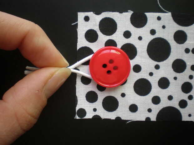 Sostener el lazo hasta el borde de la tela sin bordado para verificar la colocación. Poner el botón en la parte superior del bucle para asegurarse de que los bordes del botón cubren el lazo - Esto asegurará que el botón sostenga el lazo en su lugar.