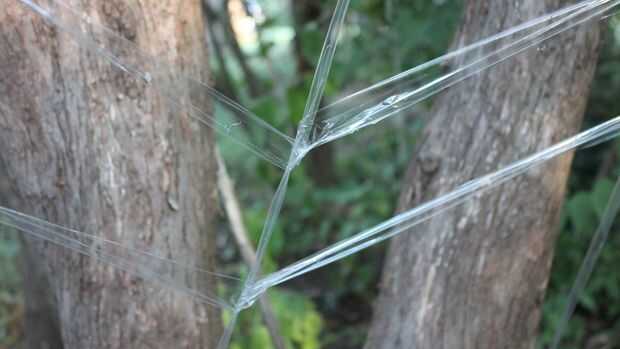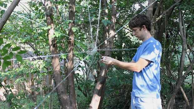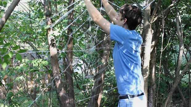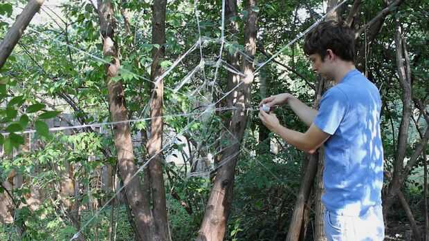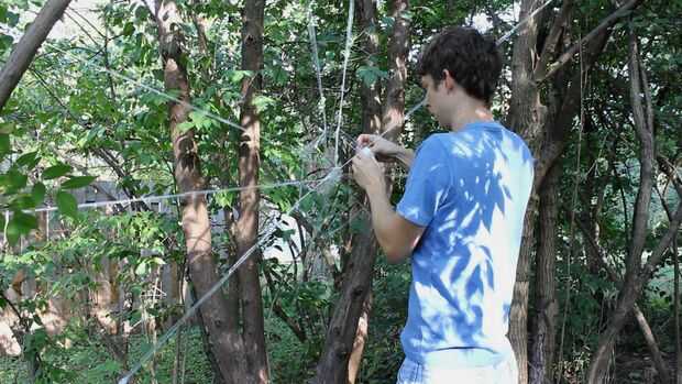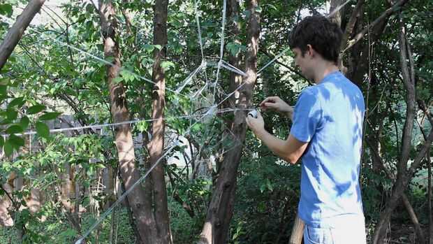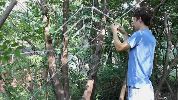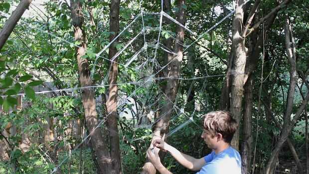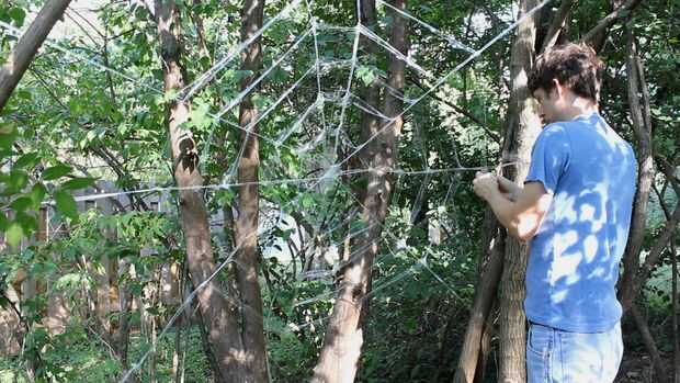 esta web fue hecha por menos de $20 y todo está tejido de cuerda de estilo tendedero común. Es cerca de 20 pies de alta y tal vez de 12 pies a lo largo de la base. Es fácil de hacer; sólo toma un poco de tiempo. Creo que me tomó cerca de cuatro horas
