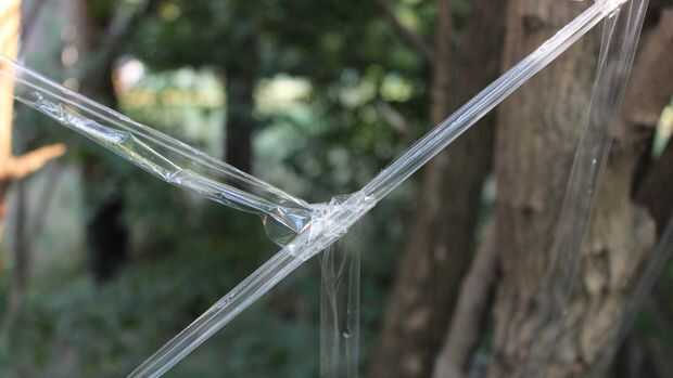 Ahora es el momento para unir los hilos de la espiral. Elige uno de los hilos radiales y envuelva firmemente la bobina alrededor de él un par de veces para crear otro punto de anclaje. Luego Envuelva el vendaje alrededor del centro de la web en una espiral. Cada vez que se cruza otro filamento de la web, envuelva el plástico alrededor de él para que ellos se atan juntos. Continúe la espiral hacia el exterior han llenado en la mayor parte del espacio de la abertura. Para poner fin a la espiral, corte la tira de plástico y envolver firmemente alrededor de la última rosca radial. Esto le dará la forma básica de una tela de araña.