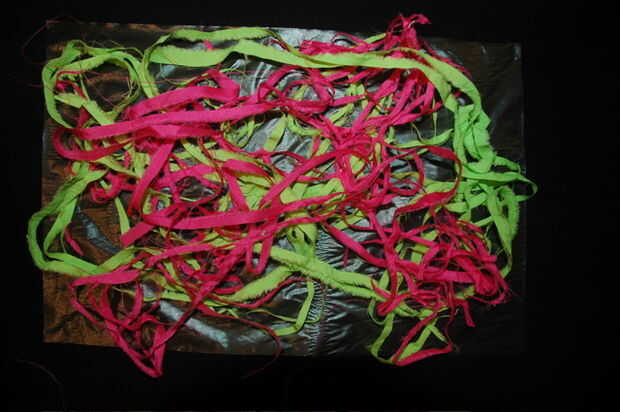 Colocar trozos de tela, yo lo llamo confeti, en la parte superior del estabilizador soluble
