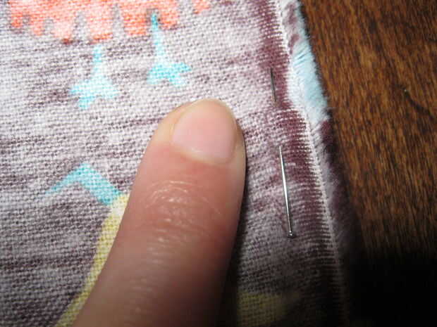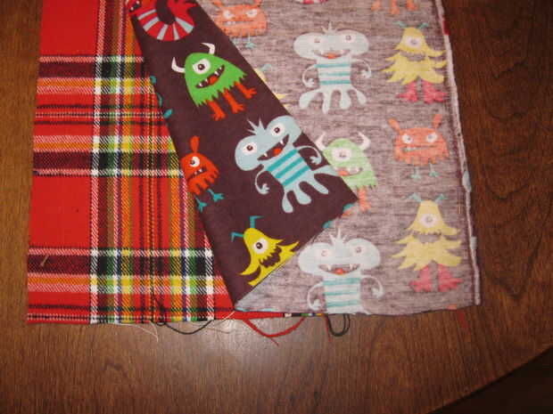 Luego tomar la otra mitad de la tela del monstruo y la otra mitad de la tela escocesa tela, derecho contra derecho juntos y los pines juntos aunque esta vez Asegúrese de que las tienes puestas en la dirección opuesta como el primero, para crear un efecto prolijo cuando haya terminado.