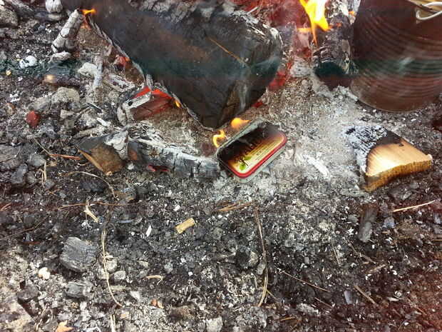 Puede en el fuego, pero no en medio del fuego, en el borde está bien. Idealmente debe raspar un poco de la cama de carbón y coloque la lata en la parte superior. Pero el borde del fuego está muy bien.