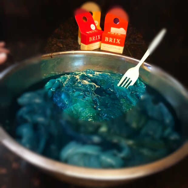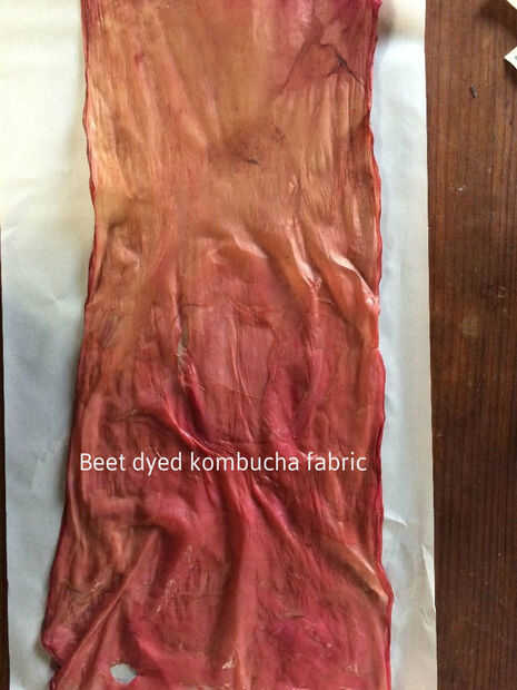 Si quieres teñir a la tela, se hace antes de secar la pieza. Un buen recurso para los tintes es Dharma Trading Company. También se pueden utilizar plantas naturales y tintes vegetales como la remolacha como se ve en la imagen. El proceso de teñido es bastante fácil. La tela adquiere tintes muy rápido pero no siempre uniformemente.