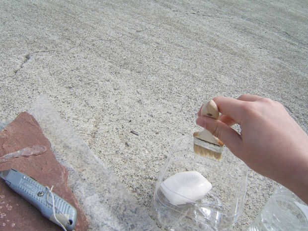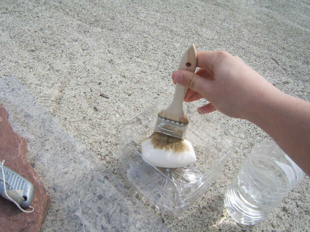 Ahora sumerja las cerdas del cepillo en el látex líquido a mitad de camino. Frotar el látex extra en el lado del contenedor para que no gotea por todas partes.
