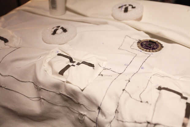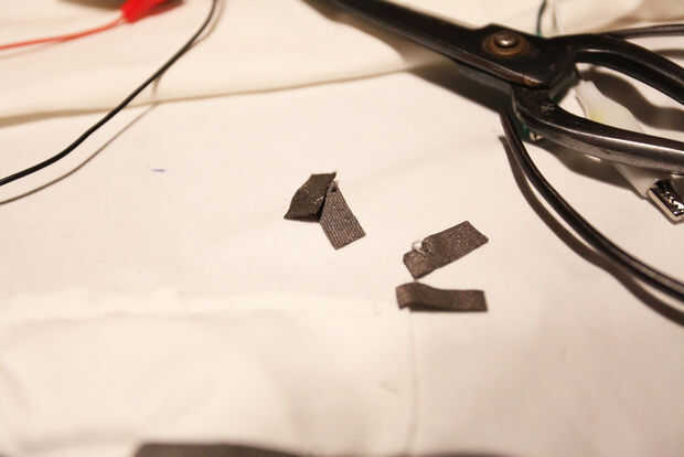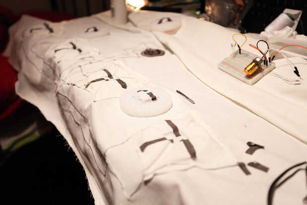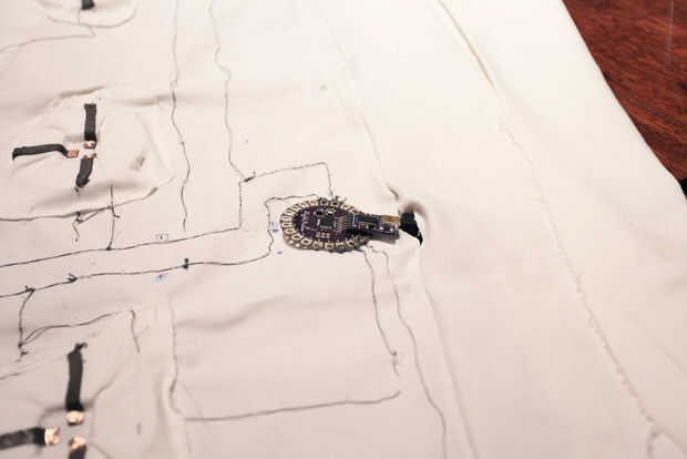 Puede usar hilo conductor para construir el circuito. Puse los hilos conductores del hilo regular tela y uso para fijarlos. Y también utilizo a tela conductora para las articulaciones.
