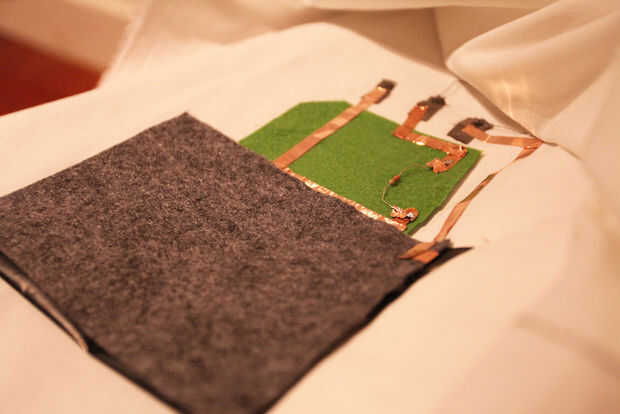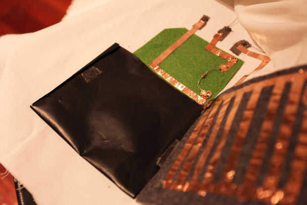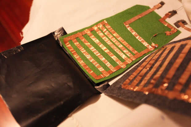 Necesitas dos trozos de tela (yo usé fieltro) y un pedazo de velostat. Utilizar cinta de cobre para hacer dos redes. Y el velostat entre estas dos redes. La conexión es a través de este pedazo de velosat. Se puede considerar como una resistencia variable. Wen que presione, pasa más electricidad. Cuando, enlazarlo con el circuito principal.