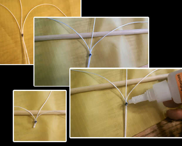 4. después de que el pegamento se seca un nudo en todas las tres cadenas que se alinea sobre las marcas superglued. Secó un poco de pegamento en el nudo atado para mantenerlo seguro.