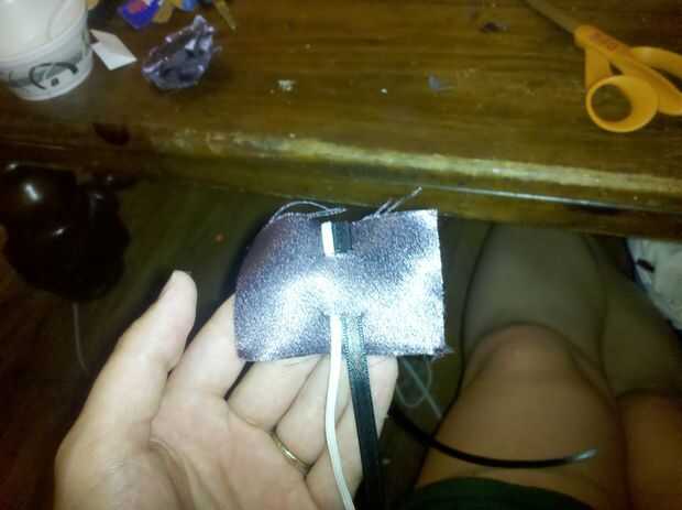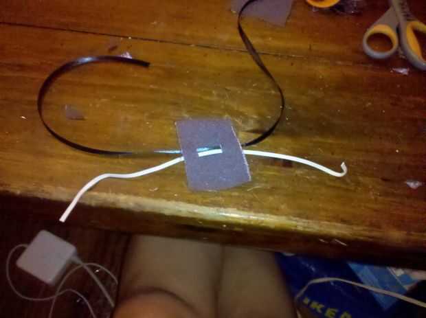 Primer paso es tomar la pieza de forro de tela y corte dos ranuras en ella. Cortar un trozo de elástico aproximadamente 8" de largo y un pedazo de cinta de aproximadamente 20" de largo. Alimentación de ambas piezas a través de las ranuras en la tela.