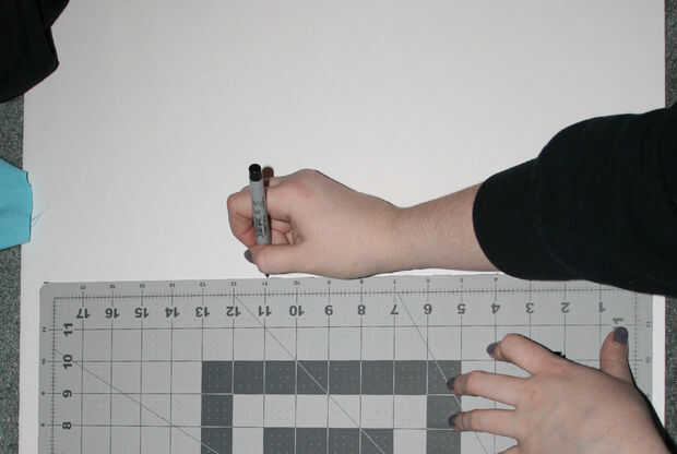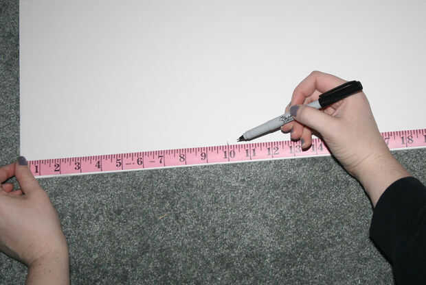 Usando la cinta métrica, coloque una marca de 10 y 20 pulgadas en la parte superior del lado largo. Haga otra marca en 10 y 20 pulgadas en la parte inferior del lado largo. Alinee el borde de la placa de corte entre las marcas superior e inferior de 10 pulgadas y trace una línea a lo largo del borde. Se trata de la línea de guía para tu primer corte. Dibujar otra línea en el borde recto en las marcas de 20 pulgadas.