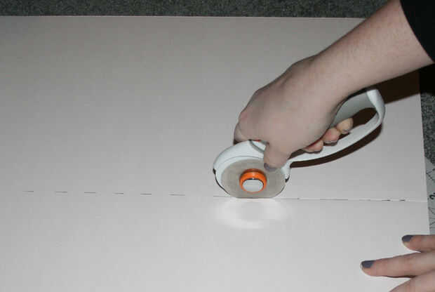 Coloque la placa de corte por debajo de su tablero de la espuma (para no dañar nada). Deslice el cortador rotatorio firmemente a lo largo de ambas líneas. Si usted no presiona lo suficiente y la espuma no es cortar completamente a través de, voltear el tablero, doblar la espuma ligeramente a lo largo de los cortes, luego correr sobre el pliegue con el cortador rotatorio para terminar el corte.