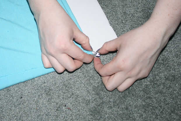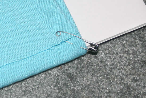 Una vez en el otro extremo de la tela, fijar la parte superior e inferior del borde a la tela por debajo de ella con pernos de seguridad. Si tu tela es realmente slouchy, utilizar un tercer alfiler en el medio así.
