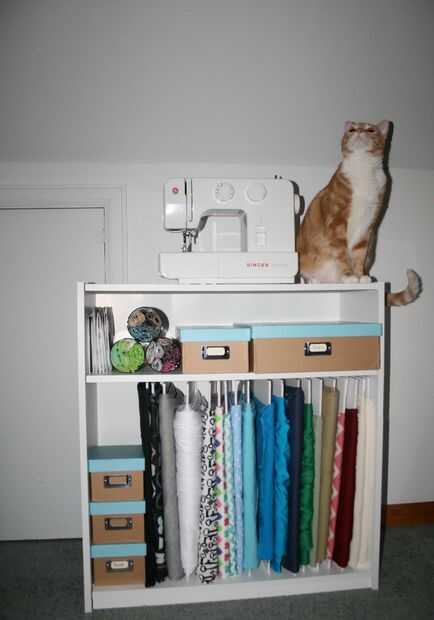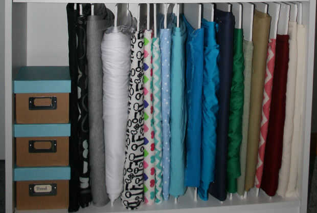 Ahora que tienes los pernos de la tela, fácilmente puede almacenarlos. Tenemos una estantería barata en Walmart como nuestra área de almacenamiento de proyecto de costura. Lo mejor de este método es que se ve muy bien y puede omitirse al aire libre si no tienes un área de proyecto dedicado. Poner en una mesa de costura, escritorio o cualquier útil que es de 20 pulgadas de altos o largo y al instante tener inspiración cuando se mire.