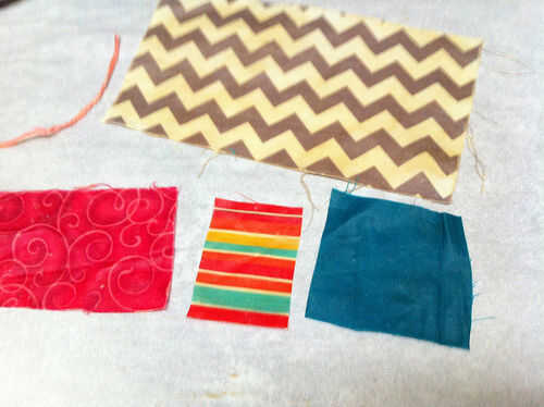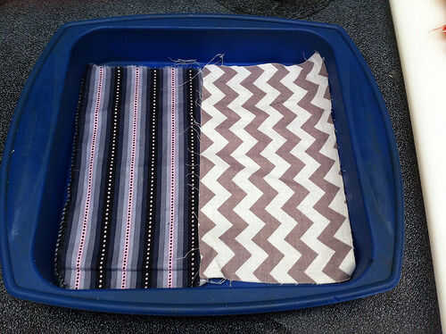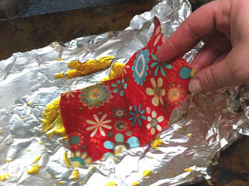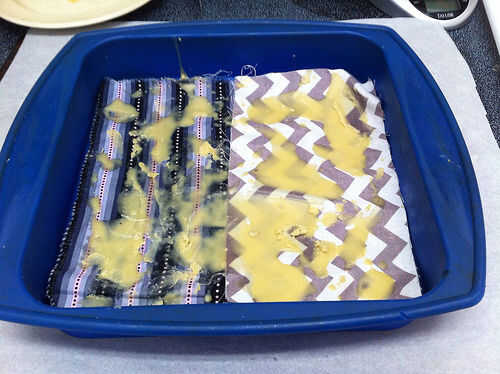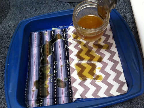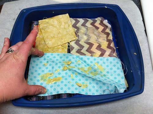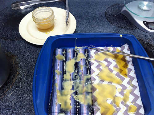 Usando pinzas o una toalla pequeña para proteger las manos del fuego, verter parte de la cera caliente del contenedor sobre la tela dispuesta. No es necesario volcar hacia fuera; simplemente rociar algunos en cada pedazo de tela. La cera se enfría rápidamente cuando se vierte sobre la tela, lo que hace imposible extender uniformemente. Por esta razón también utilizamos el horno o un secador de pelo.