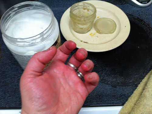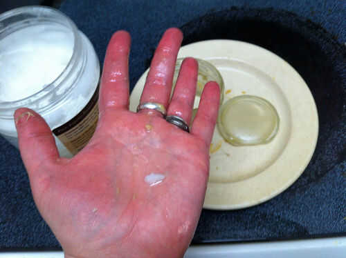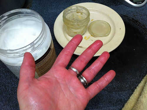 Las manos pueden ser pegajosas después de la tela de la capa (menos aún si sólo estás jugando con la tela refrigerada). Poner un poco de aceite de coco en las manos y frotarla en la cera pegajosa para ablandarlo. Limpie las cosas de las manos en una toalla de papel. Si se agrega suficiente aceite, esto puede hacer bálsamo del jardinero agradable para las manos secas.