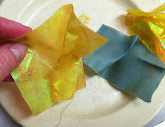 Tul - los agujeros en tul son demasiado grandes para que funcione por su cuenta. Estaba bien capas sobre celofán iridiscente, pero encontré que el celofán puede mantener la capa de cera sin ningún recubrimiento de tela