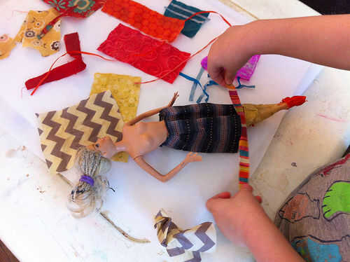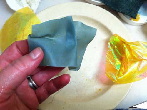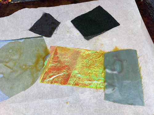 Celofán iridiscente - no creo que la cera se pegaría a esto, pero lo hizo y es una gran adición a un juego de moda de muñeca. La cera de la iridiscencia silencia, pero sigue siendo bastante brillante (Asegúrese de no utilizar una capa demasiado gruesa) y pega bien.
