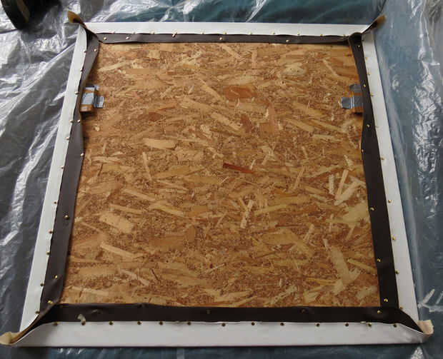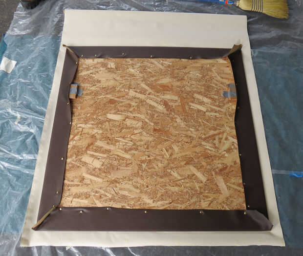 Repetir el procedimiento utilizado para el vinilo para tapizar la tela a la base, con chinchetas. El trabajo de los centros de ajuste como vas un poco a la vez. Puede dejar las esquinas sueltas por ahora, se pueden doblarlos apretados en las barras del ensanchador final más adelante.