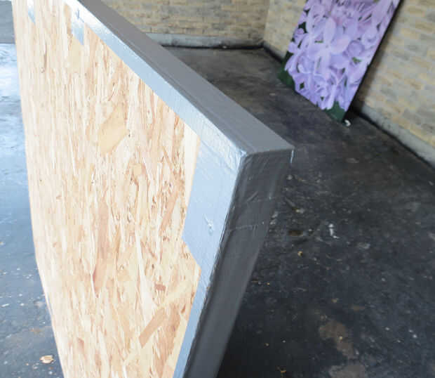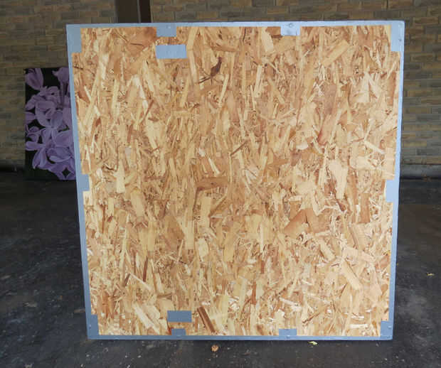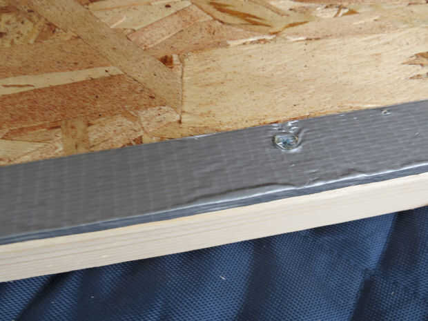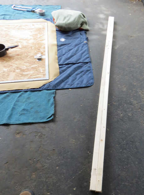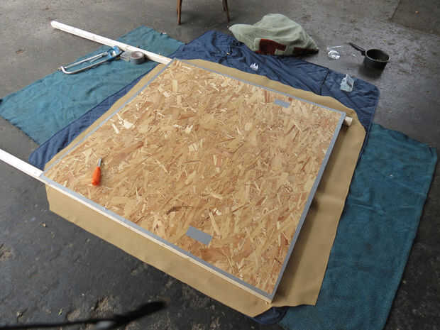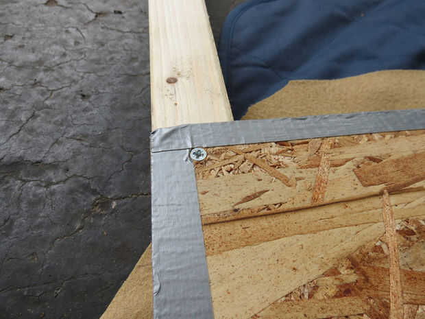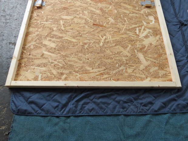 En su alfombra o manta establecer la longitud de 2 x 2" de madera a lo largo de los bordes izquierdos y derecho de la hoja de madera. Poner el lado bueno de la hoja de madera en la parte superior el 2 x 2" s. atornillarlas a la hoja desde el lado bueno. Usé 4 tornillos en cada lado, atornillar para las puntas lo hizo a través de la hoja, lo suficiente para morder el 2 x 2 "s. Asegúrese de que la madera está perfectamente alineada con los bordes y extremos y atornillando al ras del acabado. Si usted no precortado, cortar la longitud sobrante, cuidando de no de la viruta de las esquinas. Medir los bordes superior e inferior restantes, cortar su 2 x 2 "s a (recuerda que no son exactamente 2" de ancho) y en los bordes exactos, con unos tornillos a cada lado. Martillo cualquiera los tornillos que se pega para arriba y conducto de cinta adhesiva sobre las cabezas. Liberalmente conducto cinta adhesiva todos los bordes de la madera así.