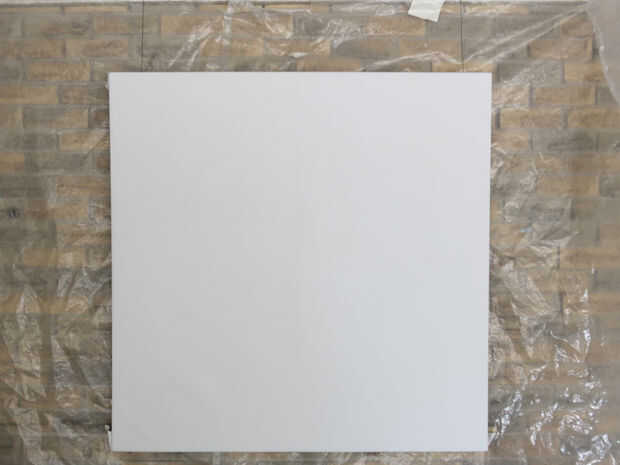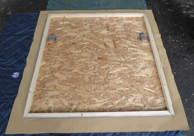 Coloque el lado bueno de la tela previamente preparado por centro de la madera cubierto de vinilo y trazar el contorno de la plaza en la parte posterior de la tela previamente preparada con el lápiz para hacer colocándolo en barras del ensanchador permanente más fácil más adelante. Estire y virar el lienzo sobre la capa de vinilo como antes, a partir de los centros de las barras y trabajando hacia fuera 5-6 pulgadas a la vez va alrededor y alrededor para mantenerla incluso.