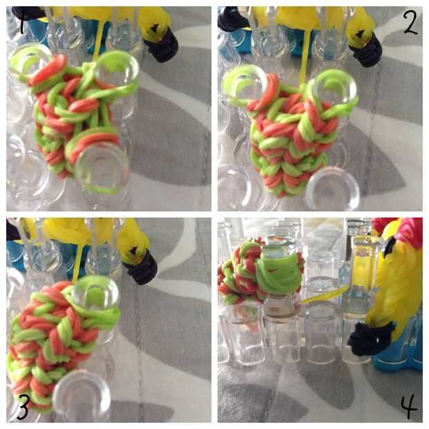 Cuando su agarre de lápiz es suficiente, tienes que quitarlo. Personalmente, prefiero apretones más cortos, pero te puede gustar más unos, entonces, hacer lo que quieras. Así que para remover el mango, agarra todas las bandas en una clavija y llevarlo en diagonal, como se muestra en la imagen. Entonces tome algunas otras bandas de otra clavija, como se muestra. Por último, hacerlo uno más una peg es la celebración de todas las bandas. Los pasos se muestran en el cuadro.