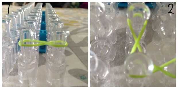 Así que ya podemos empezar! Esto probablemente tenga un rato, así que asegúrese de que se siente a gusto =) en primer lugar, asegúrese de que el telar está en una posición rectangular, como se muestra arriba. Luego tomar una sola banda y tuerza en una figura ocho. Colocarla en la parte inferior de su telar. Luego gire uno otro en un cuadro ocho y colóquelo como se muestra en la imagen.