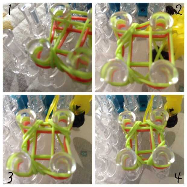 Ahora aprenderá lo del telar. En primer lugar, ¿viste la capa de fondo en el paso antes de éste? Siempre vas a telar sólo la capa del fondo cada vez que agregue más bandas. Por lo tanto, no entra cualquier bandas! Eso es un gran no no! Permanecer en el exterior y agarra las bandas de la parte inferior dos y llevarlos encima peg en el medio como se muestra en la imagen. Hacer lo mismo en todas las cuatro esquinas como se muestra.