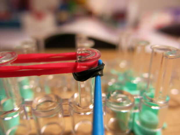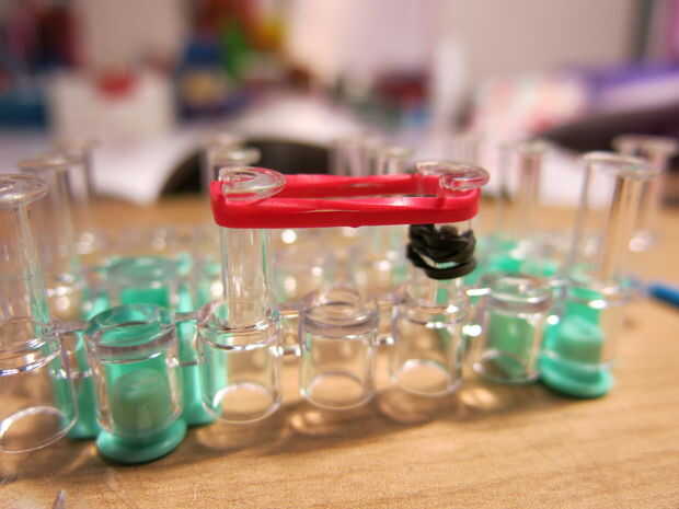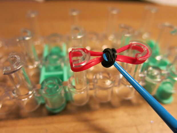 2. ahora, usando su gancho, deslice la banda negra en las bandas rojizas. Debería verse como la foto 3 ahora.