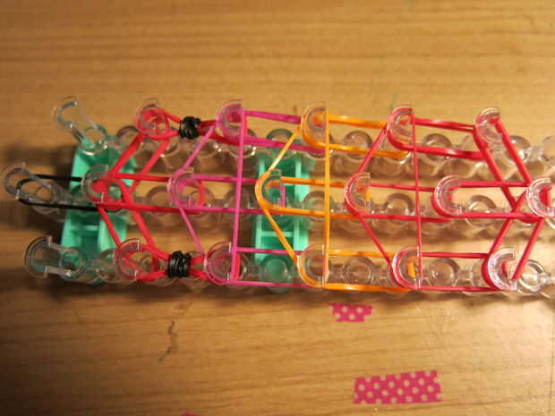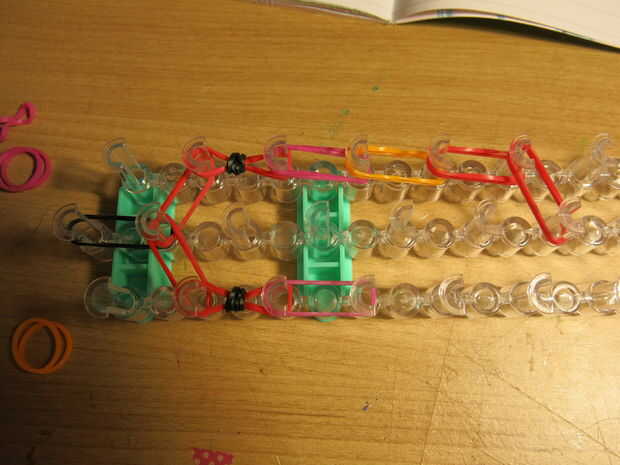 5. ahora en la fila media de pins, continuando con la banda negra, lugar bandas abajo como este (doble cadena): rojo, rosa, naranja, rojo, rojo. Todas las filas de bandas deben reunirse allí.