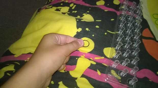 a la altura de la manía de goma, mi hijo decidió que quería un telar también. Bien, en el momento, hubo interés. Así fue hasta que lo hacen uno. Encontré un trozo de madera de unos dos pies de largo, martillado en un montón de clavos. Los clavos no e