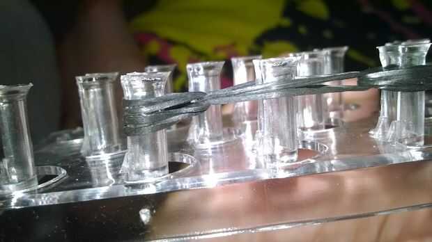 a la altura de la manía de goma, mi hijo decidió que quería un telar también. Bien, en el momento, hubo interés. Así fue hasta que lo hacen uno. Encontré un trozo de madera de unos dos pies de largo, martillado en un montón de clavos. Los clavos no e